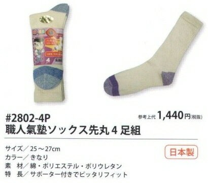 サポーター付きでピッタリフィット【作業・カジュアルソックス】福徳産業(ふくとくさんぎょう)職人氣塾ソックス きなり 先丸 4足組 2802-4P【410】
