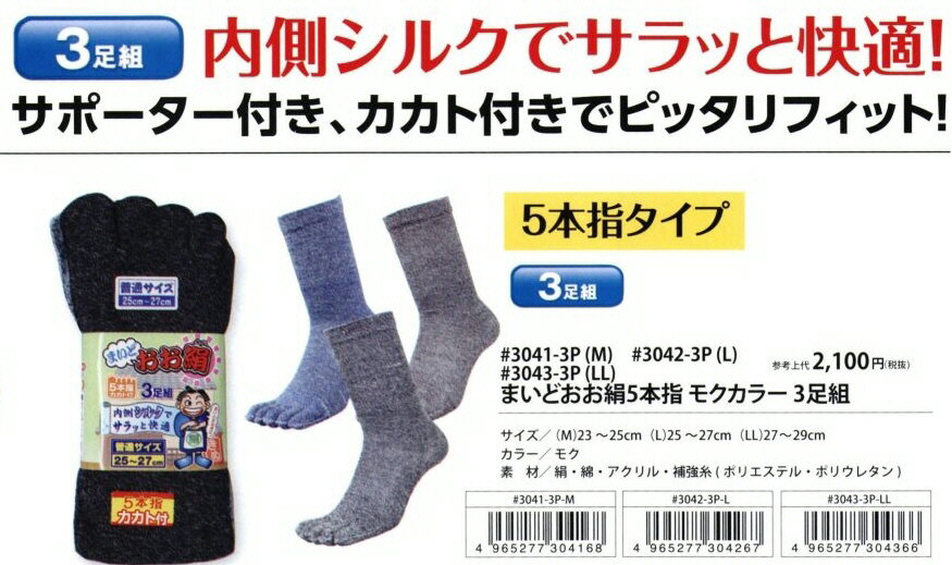 内側シルクでサラッと快適なソックス【作業・カジュアルソックス】福徳産業(ふくとくさんぎょう)まいどおお絹ソックス 5本指 モクカラー 3足組 3042-3P(L)【410】