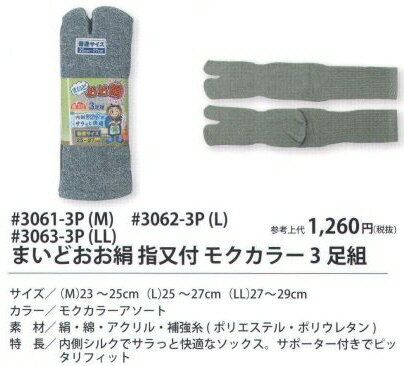 内側シルクでサラッと快適なソックス【作業・カジュアルソックス】福徳産業(ふくとくさんぎょう)まいどおお絹ソックス 指又付 モクカラー 3足組 3062-3P(L)【410】