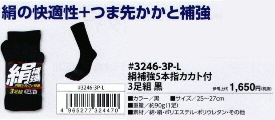 内側シルクで快適!つま先かかと補強【作業・カジュアルソックス】福徳産業(ふくとくさんぎょう)絹補強 ソックス 5本指 黒 3足組 3246-3P-L【410】