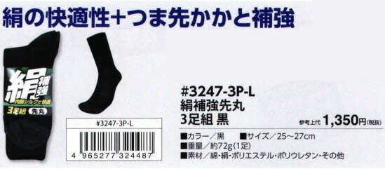 内側シルクで快適!つま先かかと補強【作業・カジュアルソックス】福徳産業(ふくとくさんぎょう)絹補強 ソックス 先丸 黒 3足組 3247-3P-L【410】