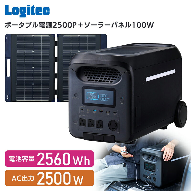 [ポタ電]日本語表記の為、使い方がわかりやすい。 [ソーラーパネル]表・裏の両面でより多くの太陽光を得て、効率良く発電可能。【ふるさと納税】【940-01】ロジテック ポータブル電源 2500P ソーラーパネル 100W セット 容量 2560Wh AC出力 2500W【DE-PS2500PLBK+MPA-SP100DLNV】