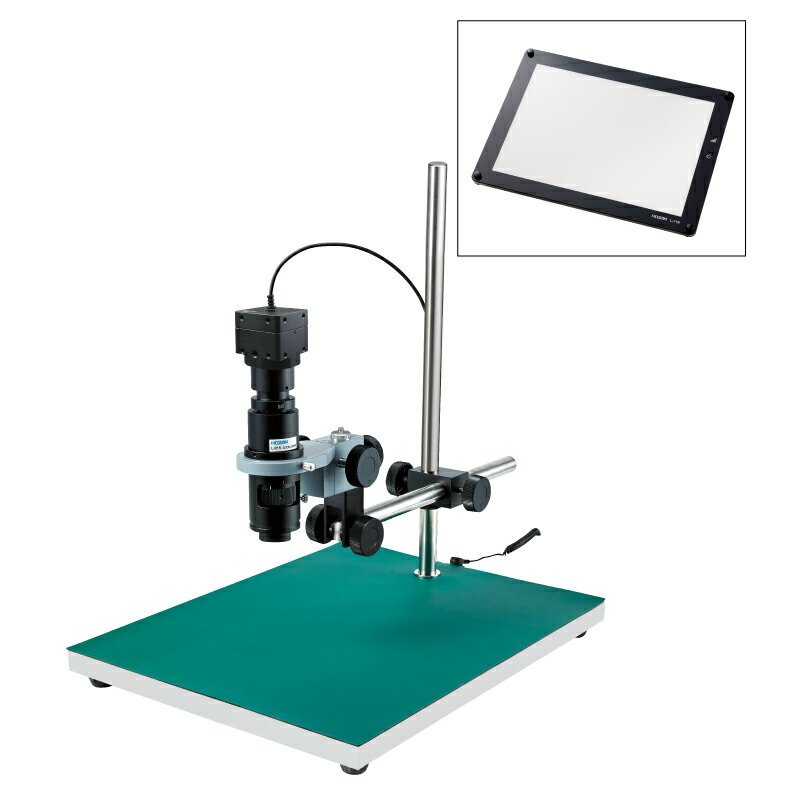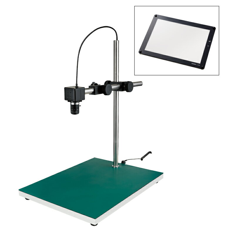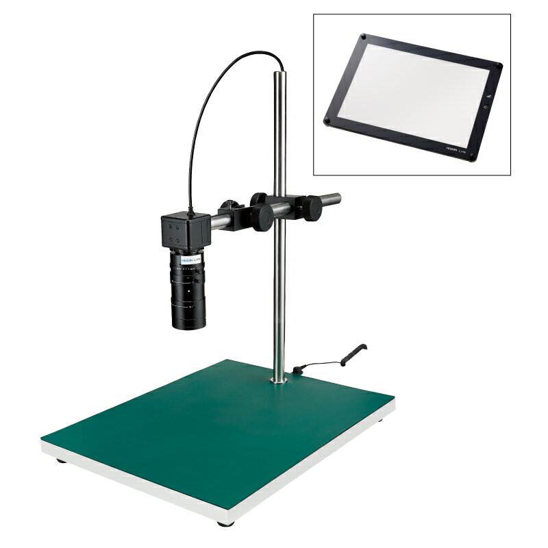 商品説明 価格と性能を両立した300万画素USBカメラのセットです。A4サイズの面発光照明付き。レンズは作動距離を自在に調整できる高画質レンズです。大きさに加え高さもある観察対象や、作動距離を大きく取りたい場合におすすめです。通常3~4日以内に発送します。 視野 65×49~30×22mm 倍率※1 8.6~18倍 作動距離 410~250mm ベース寸法 350(W)×450(D)mm ※スペックは計算値です。 ※1. 24型ワイドモニター:解像度1920×1080 使用時 取扱説明書ダウンロード