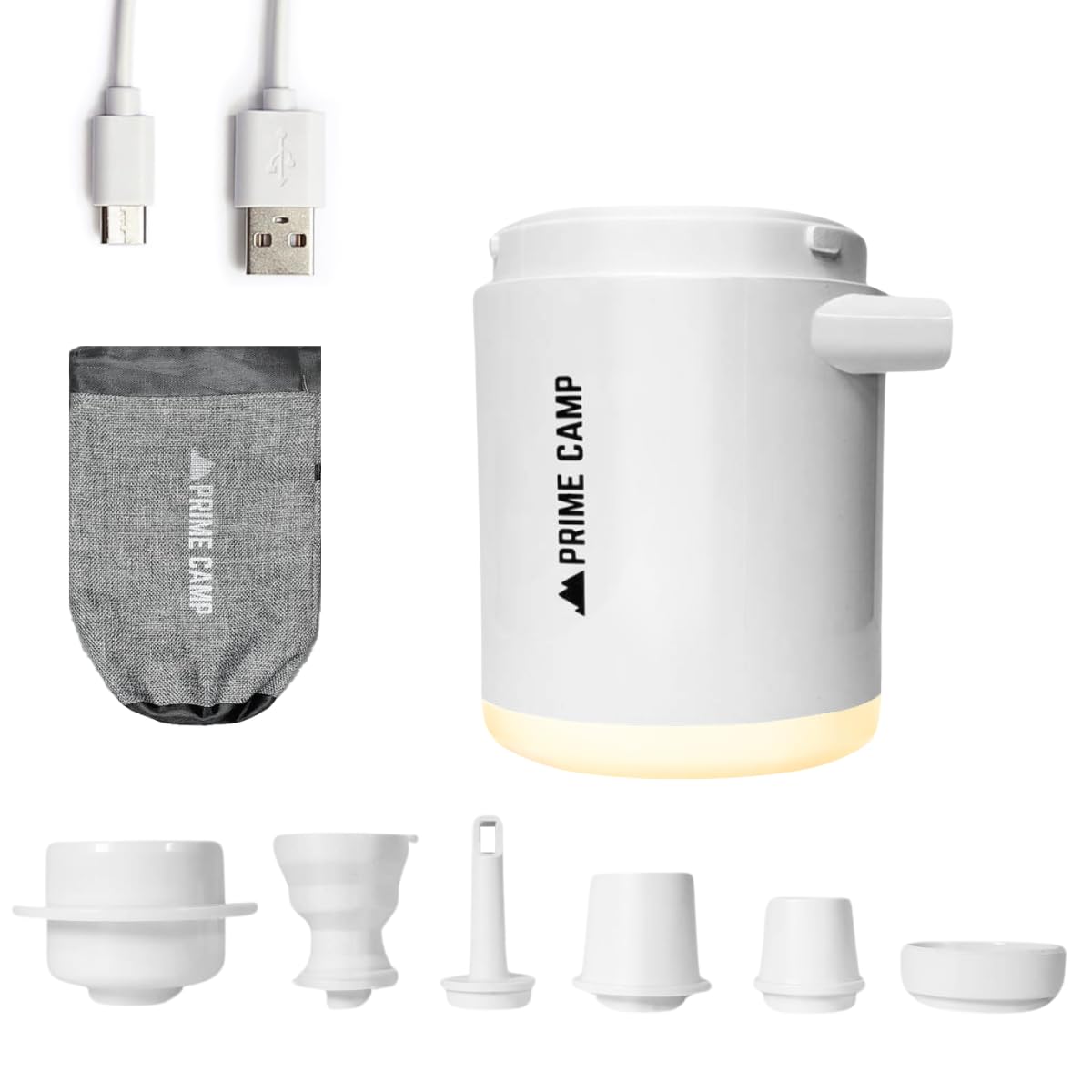 プライムキャンプ エアーポンプ 電動 空気入れ 超軽量 強力170L/分 【6つのノズル&ライト付】 エアポンプ 1380mAh大容量バッテリー USB充電式 空気抜き インフレーターマット キャンプ 浮き輪
