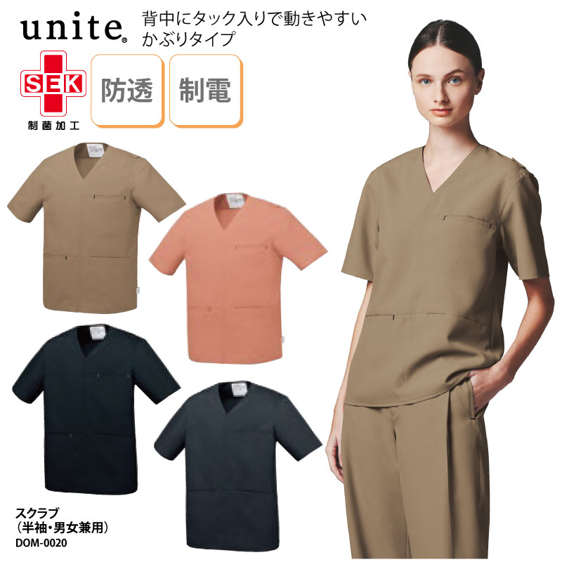 背中にタック入りで動きやすい、かぶりタイプの男女兼用スクラブスクラブ 男女兼用 ユナイト UNITE 医療 メディカル 半袖 白衣 看護 ナースウェア 医師 ドクター 介護 制電 制菌 透け防止 機能性 シンプル スタイリッシュ かぶりタイプ ユニセックス カラー ピンク ネイビー ベージュ グレー DOM-0020 刺繍 プリント