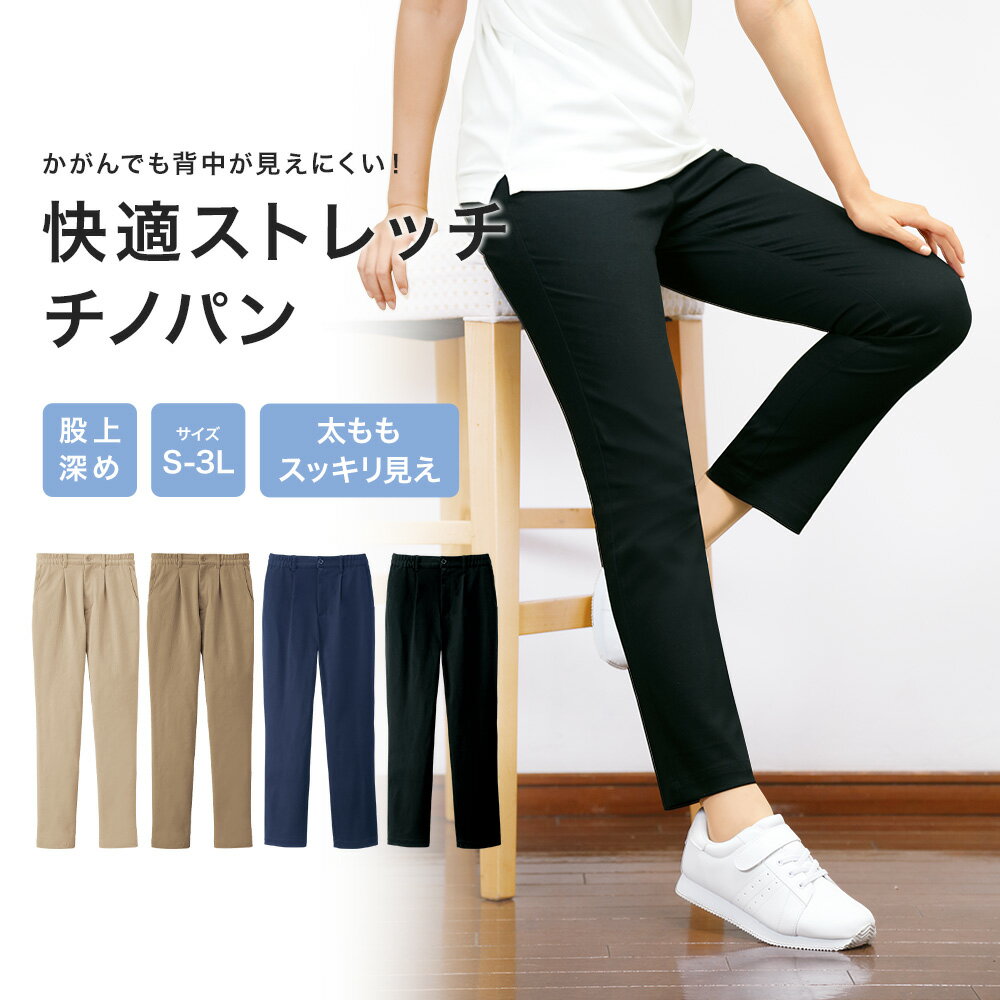 ユニフォームとしてもおすすめ!かがんでも背中が見えにくいチノパン。動きやすい快適ストレッチチノ(股上深め)【介護士 パンツ 看護 病院 保育士 体型カバー ユニフォーム 定番 シンプル ケア ヘルパー 黒 ナースリー 人気 おすすめ】2166