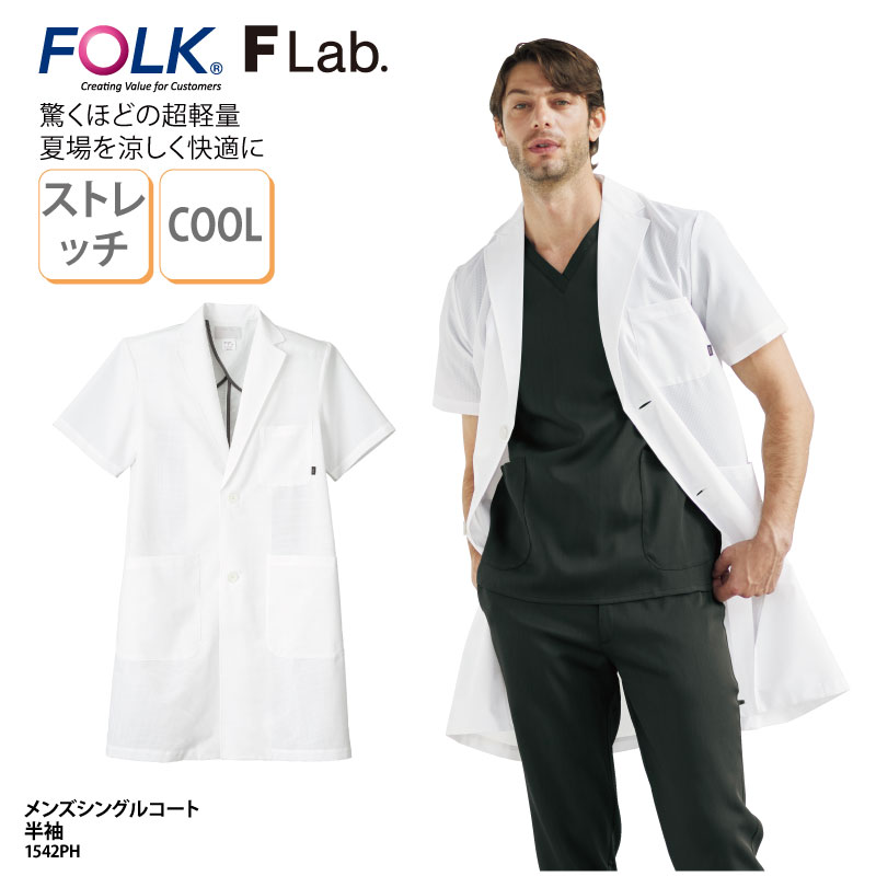 こだわり抜かれたデザインのメンズコートドクターコート 白衣 FOLK 半袖 診察衣 シングル 医療 メディカル ドクター メンズ 男性 診察 歯科 薬局 クリニック 動きやすい 1542PH 刺繍 プリント