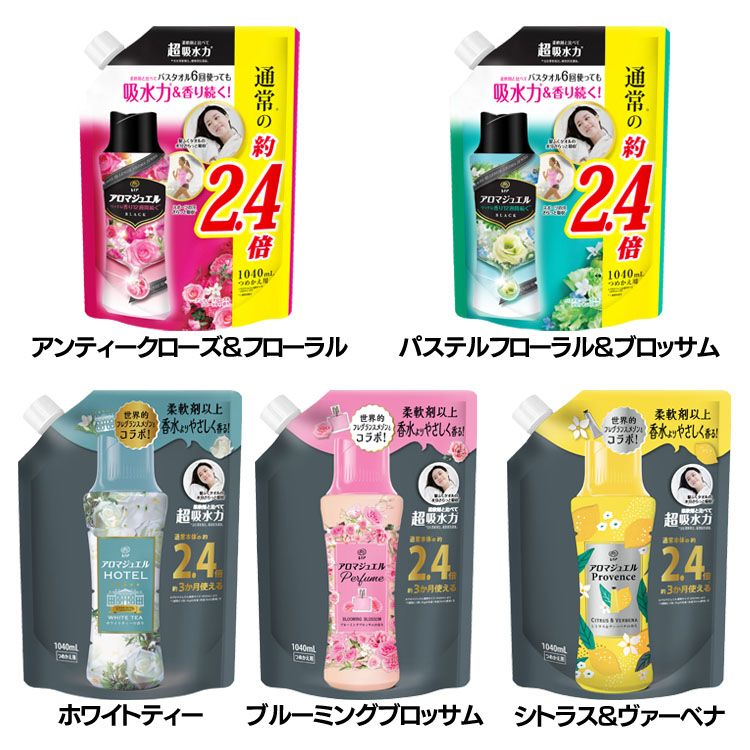 バスタオルを6回使っても、柔軟剤と比べて吸水力*&香り続く!髪ふくタオルの水分さらっと吸収*、スポーツの汗さらっと吸収*・いい香りが12週間続く*1・柔軟剤と比べて吸水力*&香り長続き・お洗濯のはじめに入れるだけ!・縦型ドラム式どちらでもOK・環境のことを考えたエコなつめかえ用・通常※の約2.4倍 ※アロマジュエル通常サイズ(420ml)より*当社柔軟剤比。複数回洗濯後。/*1保管状態にて・アンティークローズ&フローラル:甘いピーチの香りにアプリコットやカシスの温かいトロピカルな要素をブレンド。さらに重なるフローラルの香りで洗練された印象へ。・パステルフローラル&ブロッサム:アップルブロッサムの繊細で自然な香りに果樹園を感じさせるシトラスの爽やかさが重なり、みずみずしくクリアな香りへ。≪世界的フレグランスメゾンとコラボ≫・ホワイトティー:5つ星ホテルの香り、気品あるホワイトティーに清楚なすずらんを重ね、贅沢なときめきを。・ブルーミングブロッサム:パリで人気の香水の香り、ローズの優美な香りにホワイトムスクの繊細さを重ねた、甘く洗練された大人フローラル・シトラス&ヴァーベナ:プロバンスのハンドクリームの香り、プロバンスを想わせるさわやかなシトラスに、ヴァーベナやリリーの可憐な花々を重ね、誰からも好かれる透明感のある香り。※リニューアルに伴い、パッケージ・内容等予告なく変更する場合がございます。予めご了承ください。●内容量:1040ml(詰め替え用)●成分:安定化剤、香料●使用上の注意:子供の手の届くところに置かない。認知症の方などの誤飲を防ぐため、置き場所に注意する。用途外に使用しない。●応急処置:万が一、飲み込んだ場合は水を飲ませる、又、目に入った場合はこすらずに水でよく洗う等応急処置をし、医師に相談する。●注意事項:香りの感じ方には個人差があります。使用量の目安を参考に、周囲の方にもご配慮の上、お使い下さい。●原産国:中国(検索用:香り付けビーズ 仕上げ剤 詰め替え用 超吸収力 大容量 衣類・タオル 香り長続き 吸水力 消臭 香り付け専用 4987176228680 4987176228734 4987176228741 4987176242198 4987176242143) 最強翌日配送対象商品に関するご案内 最強翌日配送対象商品・対象地域に該当する場合は最強翌日配送マークがご注文カゴ近くに表示されます。 最強翌日配送可能なお支払方法は【クレジットカード、代金引換、全額ポイント支払い】のみとなります。 下記の場合は最強翌日配送対象外となります。 ・15点以上ご購入いただいた場合 ・時間指定がある場合 ・ご注文時備考欄にご記入がある場合 ・決済処理にお時間を頂戴する場合 ・郵便番号や住所に誤りがある場合 ・最強翌日配送対象外の商品とご一緒にご注文いただいた場合 ・お届け先住所文字数が40文字以上の場合 関連キーワード(本商品の説明ではありません)母の日 父の日 敬老の日 こどもの日 クリスマス バレンタイン ホワイトデー ハロウィン お正月 成人の日 成人式 記念日 誕生日 卒業式 入学式 お歳暮 お中元 春 夏 秋 冬 梅雨 節分 ひな祭り 七夕 十五夜 初詣 年越し 夏祭り 花火大会 結婚祝い 内祝い 出産祝い 快気祝い 還暦祝い 古希 喜寿 傘寿 米寿 卒寿 白寿 百寿 新築祝い 引っ越し祝い 開店祝い 開業祝い 就職祝い 昇進祝い 合格祝い 銀婚式 金婚式 七五三 長寿祝い 御礼 お母さん お父さん 義母 義父 祖父 祖母 おばあちゃん おじいちゃん 娘 息子 彼氏 彼女 恋人 友達 上司 先輩 後輩 同僚 キッズ 子供 幼児 ベビー 赤ちゃん 育児 学生 社会人 シニア 10代 20代 30代 40代 50代 60代 70代 80代 90代 一人暮らし 単身赴任 主婦 主夫 新生活 家族暮らし 子育て 旅行 トラベル ライブ ホームパーティ ビジネス 法人 ギフト プレゼント香りでもリラックス♪ お届け先が沖縄・離島の場合、お届け日時のご希望に沿えない場合がございます。予めご了承ください。 ご注文前のよくある質問についてご確認下さい[ FAQ ]