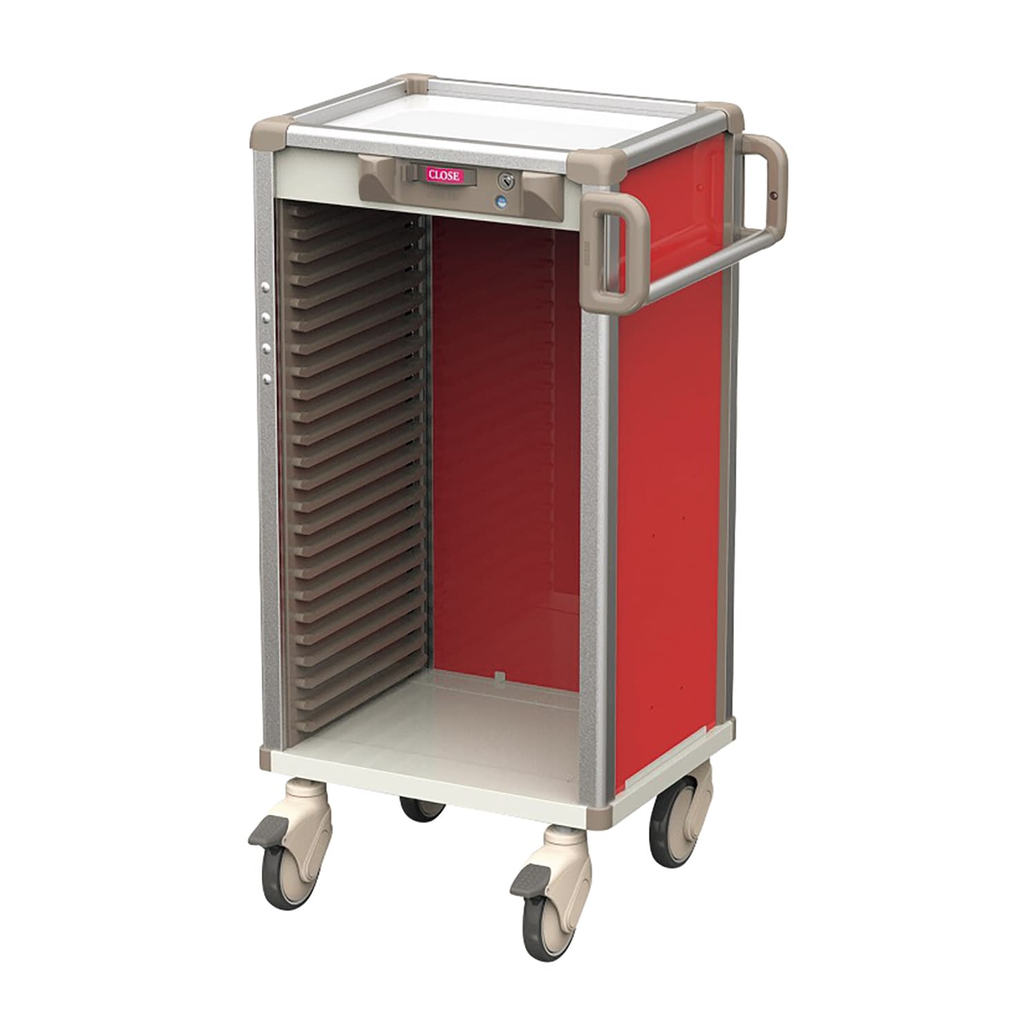 コンパクトでアルミフレーム設計により軽量化を実現しました。カート本体に別売オプションを自由に組み合わせることができます。25-4512-17、25-4512-18は背の高いものを入れる際の目隠し板です。25-4512-17はコンテナ2/3個分、25-4512-18はコンテナ4/3個分。スライドバーでコンテナのロック・解除ができ、さらに鍵を使用することでスライドバーもロックすることが可能です。カラー:赤 製品サイズ:W560×D445×H1038mm キャスターサイズ:125mm キャスター仕様:前側2輪にストッパー付 本体重量:23kg 材質:フレーム:アルミ・スチール、側面・背面・天板:アルミ合板、レール:ABS 区分:付属品 付属品名もしくは構成品セット内容:鍵2個 危険物種別:非該当 個装入数:1台松吉医科器械|総合カタログ|医療・介護・ドクター・ナース