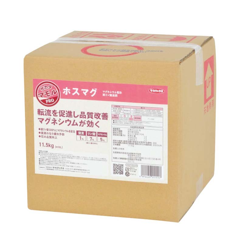 サカタマモルシリーズ ホスマグ 10L 登録番号:生第93439号 種類:液状肥料 成分:N-1 P-7 K-0 Mg-5 内容量:10L 浸透力の高い亜リン酸とマグネシウムを主成分とした液体肥料です。 マグネシウム欠乏症対策や、カリウム過剰になった植物の バランス調整に効果があります。 特に葉色に関わる問題、栽培中期以降の下葉の黄化や葉先枯れなどを 軽減する働きがあります。 また、マグネシウムには植物体内でリン酸の働きを助ける効果があるため、 リン酸の吸収を促すことができます。 マグネシウムそのものと拮抗するカリウムやカルシウムを含んでいないため、 効率的に吸収することが出来ます。 生育のあらゆる期間に使用することができ、作物の品質を向上させます。 1,000倍希釈での葉面散布がオススメです(7~10日間隔)。 酸性肥料のため石灰、アルカリ系資材との混用は出来ません。 また高濃度で散布する場合や高温時の使用では薬害に注意が必要。よく一緒に購入されている商品ホスカル 10L 亜リン酸液肥 サカタマモルシ21,307円バリカタ! 10kg 高機能ケイ酸液肥 液体肥37,609円ネイチャーエイド 20kg 有機100%液肥 8,094円類似商品はこちらホスマグ 1L 亜リン酸液肥 液体肥料 サカタ4,455円12本 ホスマグ 1L 亜リン酸液肥 液体肥料42,443円ホスカル 1L 亜リン酸液肥 液体肥料 サカタ4,488円12本 ホスカル 1L 亜リン酸液肥 液体肥料42,443円ホストップ 1L 高機能液肥 亜リン酸液肥 液4,800円12本 ホストップ 1L 高機能液肥 亜リン酸46,390円ホスカル 10L 亜リン酸液肥 サカタマモルシ21,307円ネイチャーエイド 20kg 有機100%液肥 8,094円ホストップ 10L 高機能液肥 サカタマモルシ24,167円新着商品はこちら2025/10/17種 0.5kg しろクローバー フィア 豆科牧3,111円2025/10/17種 1kg トールフェスク スパイダー2LS 2,946円2025/10/17種 1kg PVP チモシー なつぴりか 寒地3,976円再販商品はこちら2025/10/2180枚 TO トレー 12HT 9cm 12穴10,062円2025/10/212000枚 E-3R 丼小 117 穴径×高 14,701円2025/10/216000枚 SWAN ボードン袋 #25-9 18,447円2025/10/21 更新マグネシウム補給で葉の黄化を防ぐ!